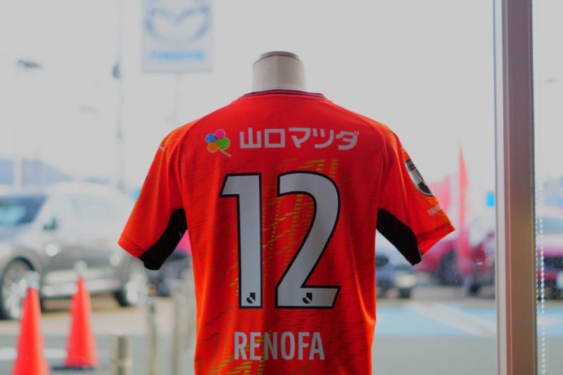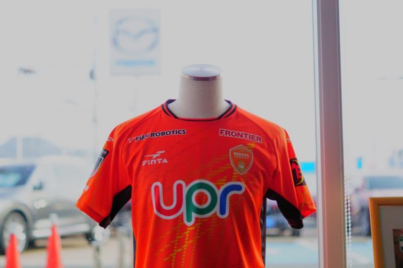 新しいデザインのレノファ・ユニフォームを山口朝田UCLに飾ってます。